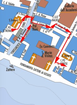 Nous quittons le Campo San Trovaso situé au sud de l'église par la droite de celle-ci, traversons une autre partie du même Campo pour traverser le Rio de San Trovaso par le pont éponyme. Nous empruntons à notre droite le Fondamenta Nani pour aller voir le Squero San Trovaso. Après le temps nécessaire à sa “contemplation“, nous revenons sur nos pas pour tourner à droite dans la Calle Larga Nani. Au bout nous tournons à gauche sur le Rio Terà de la Carita pour tourner à droite après quelques pas sur la Calle Larga Pisani. A son extrémité nous tournons à droite sur un autre Rio Terà : le Rio Terà Antonio Foscarini jusqu'au Campo Sant' Agnese.